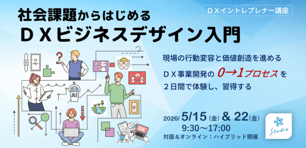 人と組織の行動変容を促すビジネスを立ち上げる一番最初(0→1)のプロセスを体験し、社会課題解決型事業、DX新事業開発の全体像を学びます。