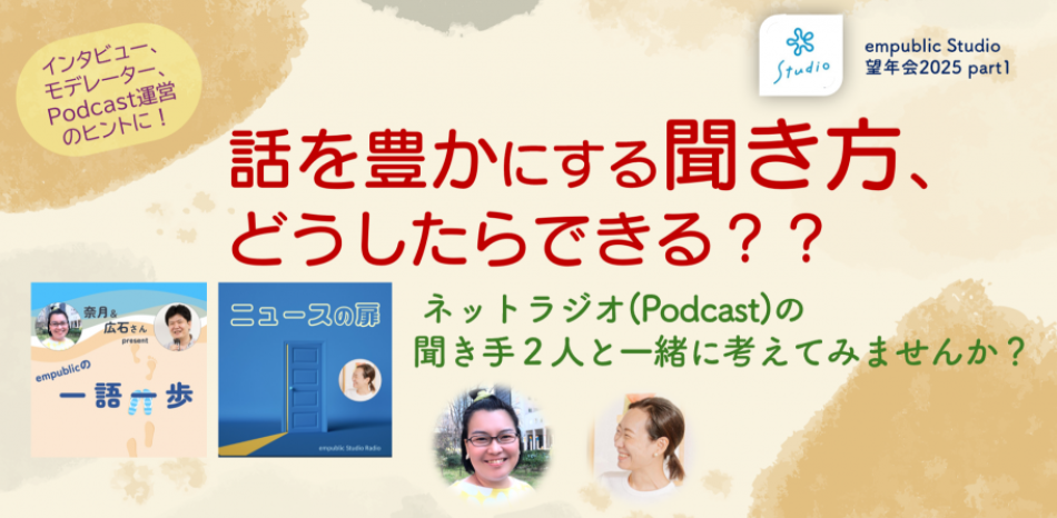 聞き方、質問、構成のポイントは、ネットラジオづくりを考えている人はもちろん、インタビューやシンポジウムのモデレーターにも活かせるヒントがたくさんあるはずです。日常のコミュニケーションや仕事にも活かせる「聞く力」を一緒に考えてみませんか?*本プログラムは、12月に開催する交流会、empublic Studio望年会2025の第1弾として開催します。一般参加の方も歓迎です!